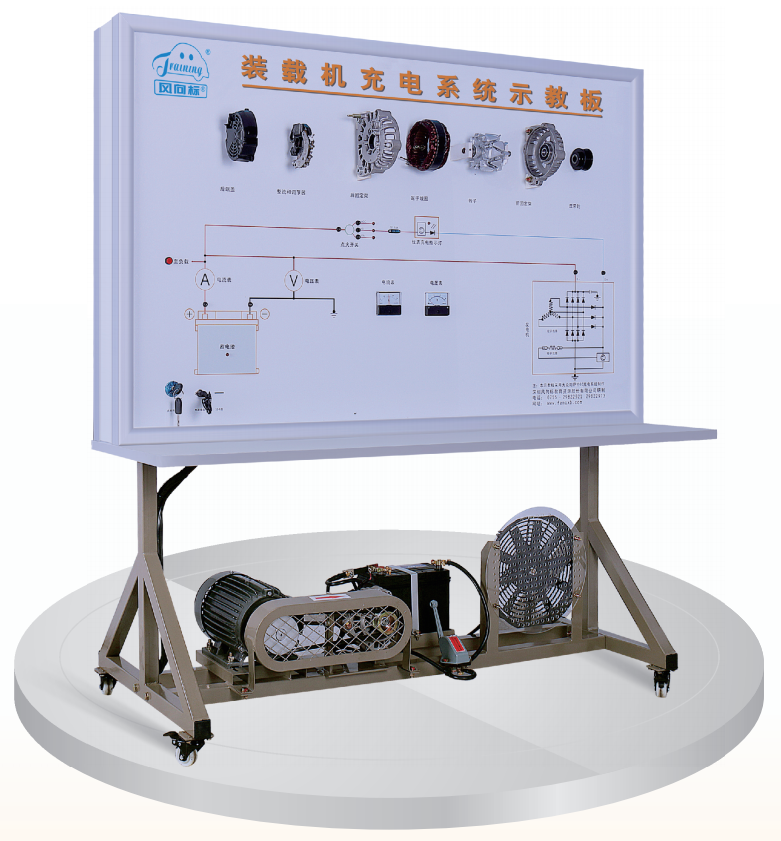 檢測控制面板、點火開關(guān)、保險絲、發(fā)電機總成、發(fā)電機總成分解部件、充電指示燈、三相異步電動機、電壓表、電流表、蓄電池、電源總開關(guān)、智能故障設置和考核系統(tǒng),移動臺架 (帶自鎖腳輪裝置)。