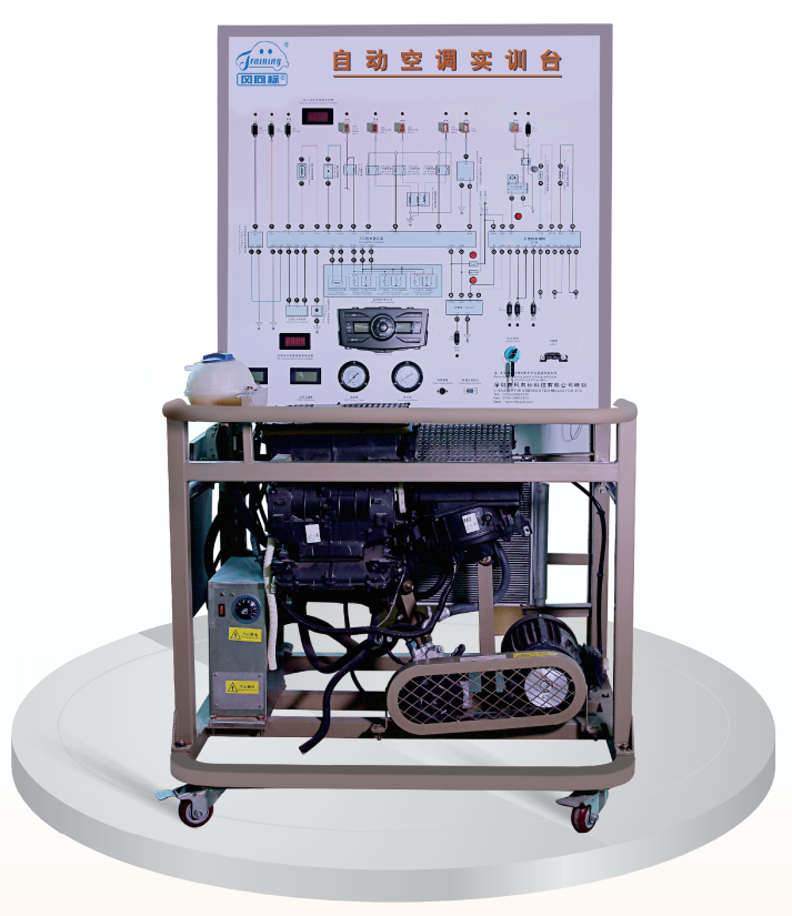 檢測控制面板、診斷座、點(diǎn)火開關(guān)、信號模擬信號板、高壓壓力表、低壓壓力表、數(shù)字式進(jìn)風(fēng)口溫度表、數(shù)字式出風(fēng)口溫度表、空調(diào)控制器總成、空調(diào)開關(guān)、空調(diào)自診斷系統(tǒng)、空調(diào)蒸發(fā)箱總成、壓縮機(jī)總成、膨脹閥總成、干燥器總成、鼓風(fēng)機(jī)總成、冷凝器、加熱器、循環(huán)水泵、冷卻電子風(fēng)扇、三相異步電動機(jī)、智能化故障設(shè)置和考核系統(tǒng)、移動臺架(帶自鎖腳輪裝置)。