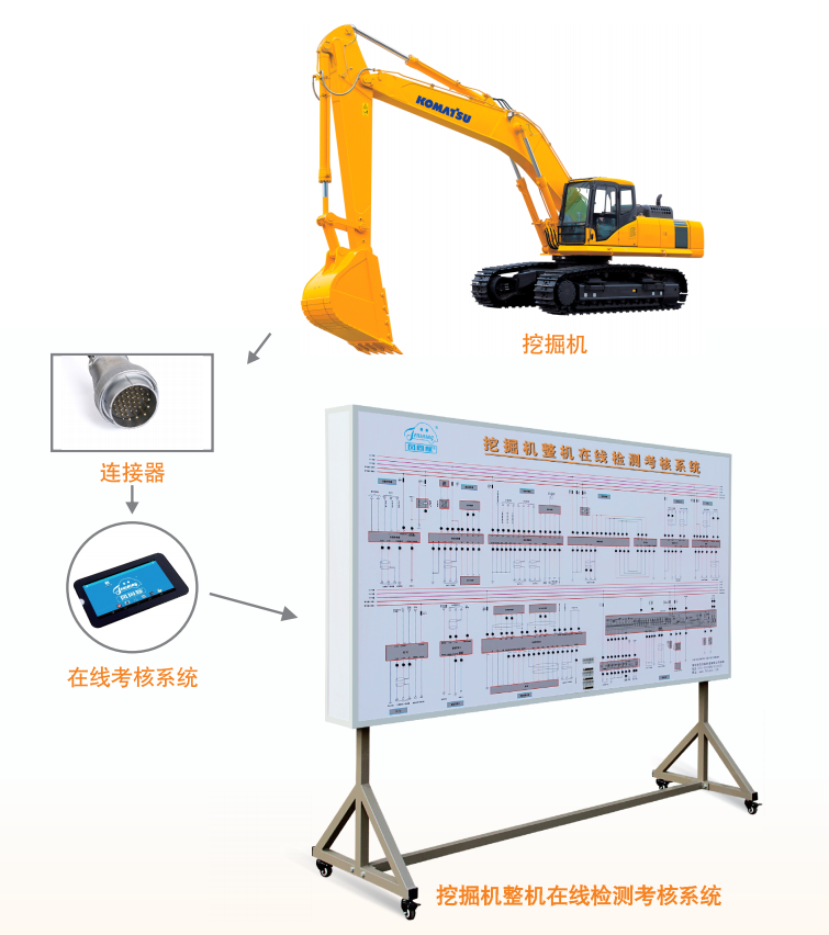 該設備將小松PC200-8原廠整機改裝為在線檢測教具挖掘機,可實現檢測與診斷挖掘機IECU、EECU、 VECU及自動空調控制單元、各電磁閥、傳感器動靜態信號參數。適合于挖掘機整機操作、維修實踐、整車理論、電液故障設置及考核的教學需要。