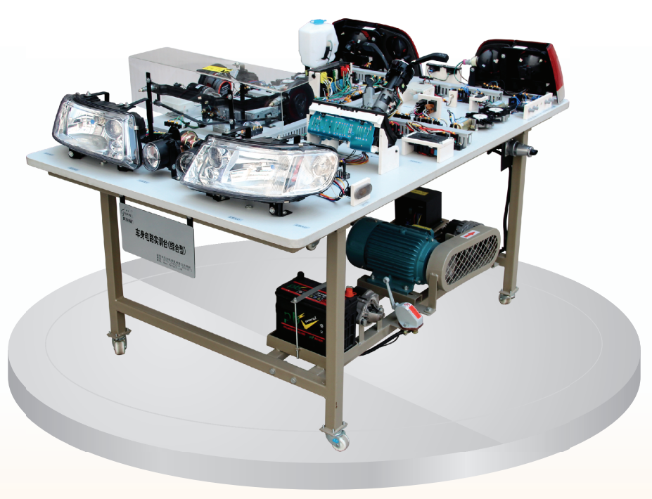實訓臺面板、組合儀表、組合開關、前燈 總成、后燈總成、雨刮總成、噴水電機、喇叭、起動機總成、發電機總成、異步電機、各傳感器、蓄電池、電源開關等。