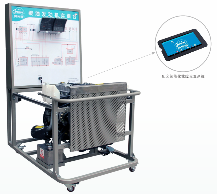 檢測控制面板,組合儀表,點火開關,普通柴油發動機總成,燃油箱,油門控制裝置,進、排氣管(帶保護罩),水箱(含不銹鋼保護罩),蓄電池,繼電器,電源總開關,智能化故障設置和考核系統,移動臺架(帶自鎖腳輪裝置)