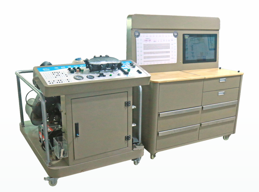 3.本產品以故障案例導入,采用故障案例教學系統,提高學生的學習興趣。本實訓設備具有幾十個故障案例,包括有起動系統、充電系統、進氣系統,點火系統,燃油系統,潤滑系統,冷卻系統,電源系統,網絡傳輸系統,等等。實訓設備還配有設備上所有的傳感器,執行器,繼電器,保險絲等都配套故障件,以及所有的傳感器,執行器,繼電器,都配有在線檢測線束。內部安裝故障設置系統,可對控制單元任意一條線路進行短路、斷路、接觸不良等故障。設故檢測臺架上最上面是檢測面板,方便測量檢測,第二到第三層是專用工具,方便使用維修和更換配件,第四層是易損配件和故障配件,測面是設故操作面板。