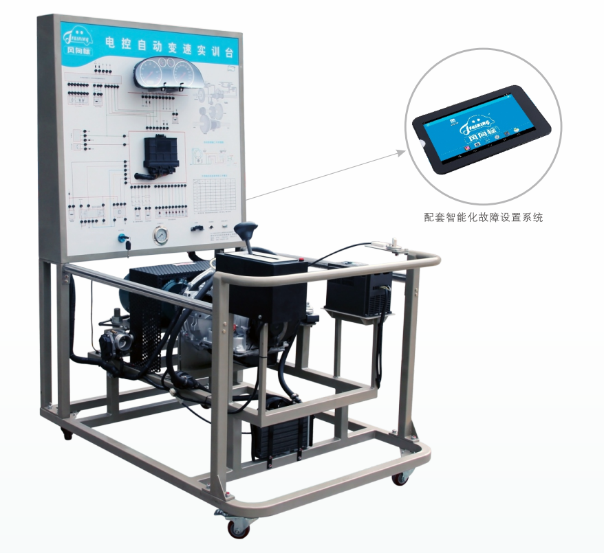 檢測控制面板,組合儀表,發動機自動變速器控制電腦(ECU),診斷座,點火開關,壓力表,自動變速器總成,節氣門總成,曲軸傳感器及信號盤,變速器檔桿總成,變速器油散熱裝置,三相異步電動機,變頻器,智能化故障設置和考核系統,移動臺架(帶自鎖腳輪裝置)