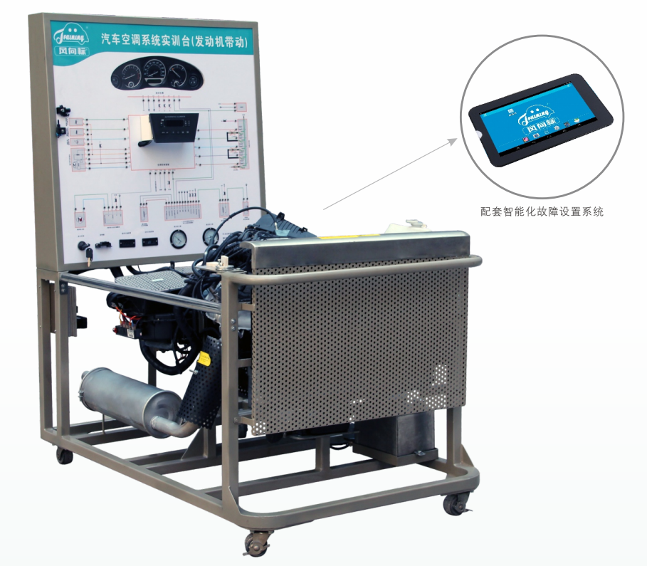 檢測(cè)控制面板,組合儀表,發(fā)動(dòng)機(jī)控制電腦(ECU),車(chē)身控制電腦(ECU),診斷座,點(diǎn)火開(kāi)關(guān),發(fā)動(dòng)機(jī)總成,高壓壓力表,低壓壓力表,數(shù)字式進(jìn)風(fēng)口溫度表,數(shù)字式出風(fēng)口溫度表,空調(diào)控制器總成,空調(diào)蒸發(fā)箱總成,壓縮機(jī)總成,膨脹閥總成,干燥器總成,鼓風(fēng)機(jī)總成,冷凝器,燃油箱,汽油泵(含汽油泵插頭)油門(mén)控制裝置。進(jìn)排氣管(帶保護(hù)置)。 水箱(含不銹鋼保護(hù)罩),冷卻電子風(fēng)扇,蓄電池,電源總開(kāi)關(guān),智能化故障設(shè)置和考核系統(tǒng),移動(dòng)臺(tái)架(帶自鎖腳輪裝置)