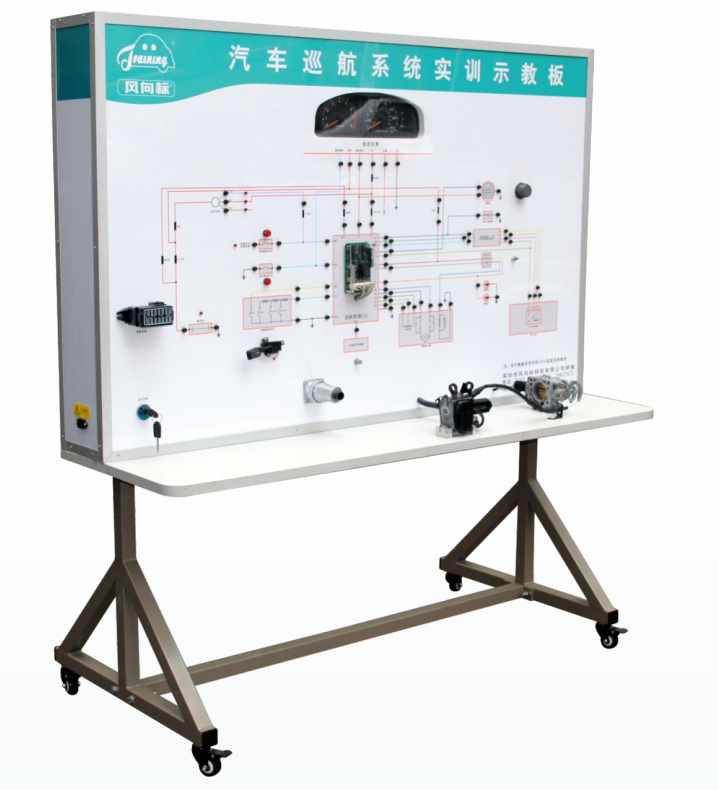 檢測控制面板,點火開關,巡航系統ECU,巡航控制執行器,診斷座,巡航控制開關,節氣門體,車速信號模擬裝置, 模擬制動火。制動燈開關。 模擬駐車制動火。駐車制動火開關。 模擬《航指示火燈。 數字式車速表。 智能故障設置和考核系統,移動 臺架(帶自鎖腳輪裝置)
