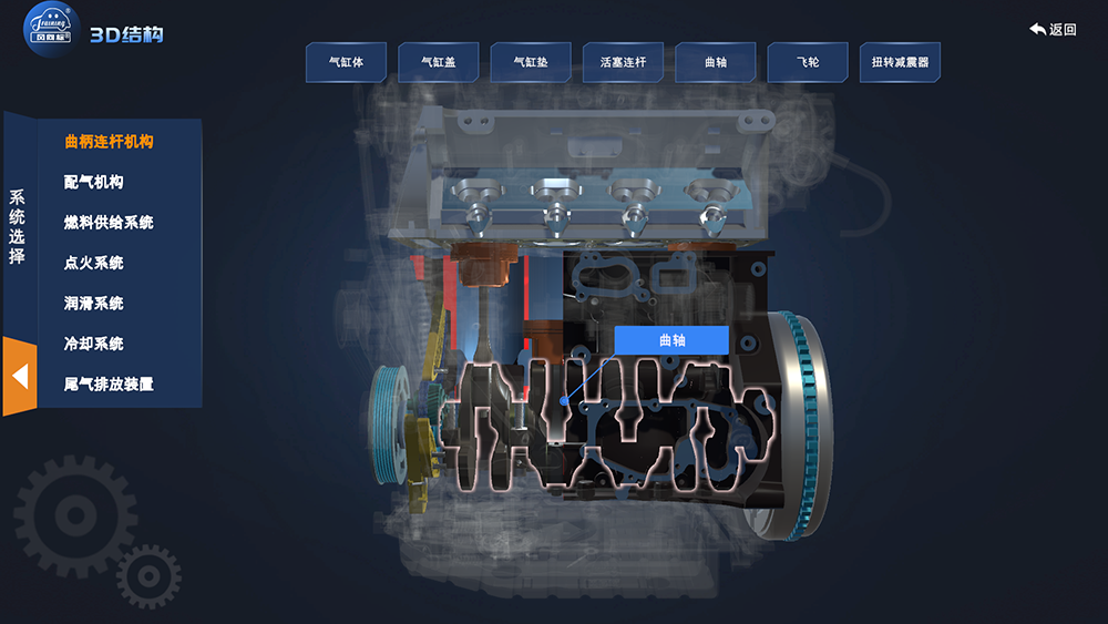 1)3D結構模塊模型是可拖拽、可三百六十度旋轉,可任意放大縮小的,學生可以從不同的角度觀察功能模塊的構造。并在功能說明區域配有文字講解該部件名稱及功用。點擊返回按鈕,可返回系統模型界面,點擊其他部件繼續學習。